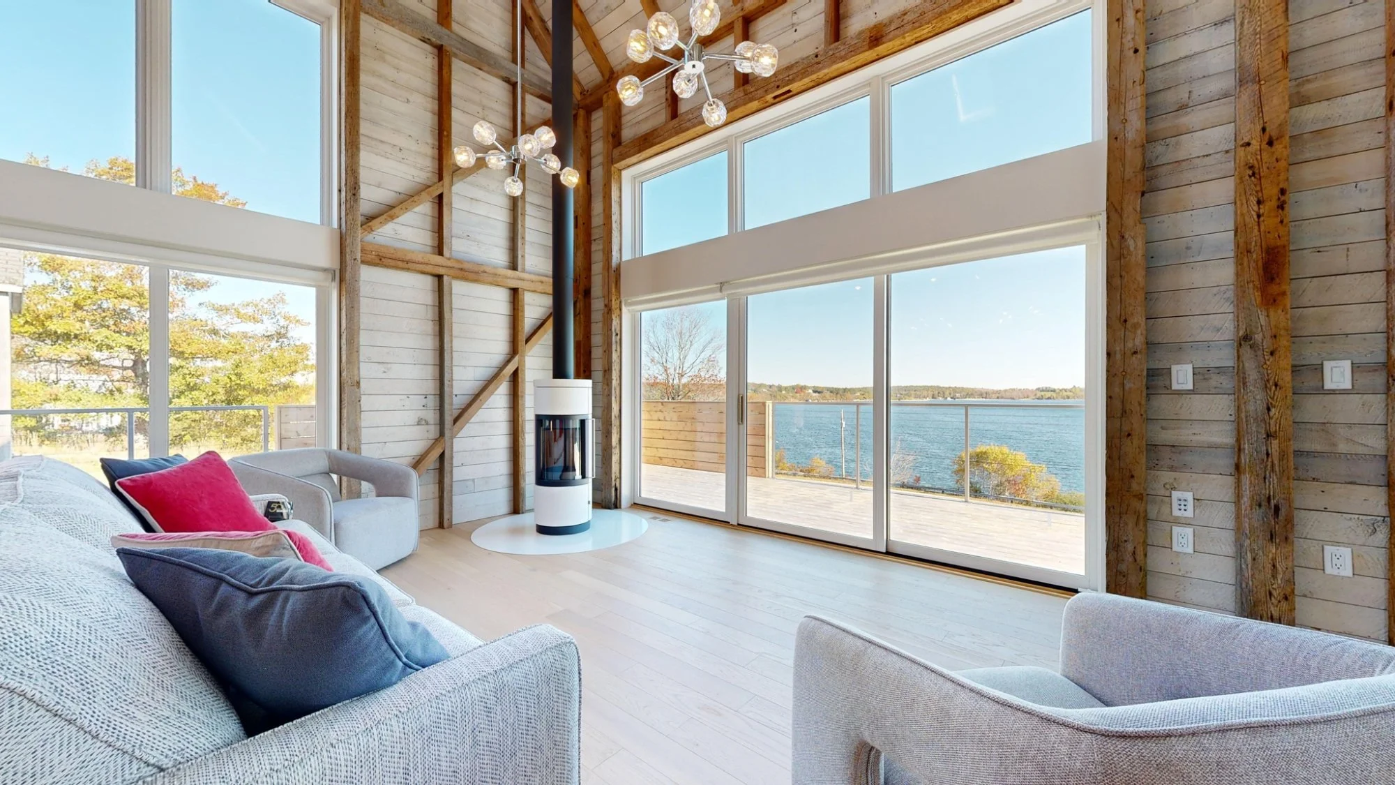 Designed by architect Nicolas Fudge, the residence features clean lines, high ceilings, and reclaimed wood accents that bring warmth and texture to its contemporary design. Expansive windows flood the interior with natural light and showcase panoramic views of the water and surrounding countryside.