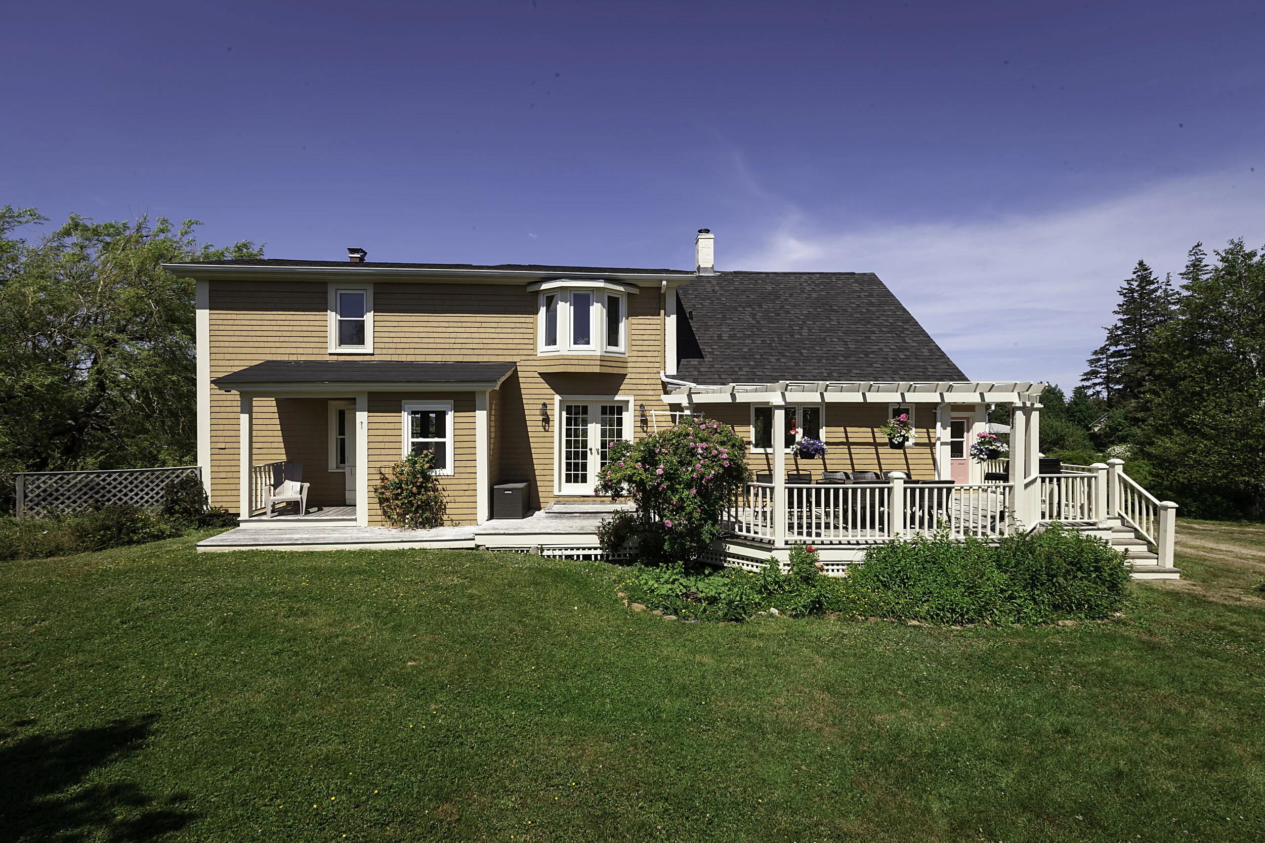 The Farmhouse: This 150-year-old Farmhouse is in excellent condition inside and out. Facing the ocean, the house comfortably sleeps 9 people (13 including the sofa beds). Upstairs offers 3 bedrooms: 2 rooms each have a queen bed, dresser and sitting area, 1 smaller room has a double bed, dresser, and closet. There is a full bathroom located upstairs with a bay window, double sink, vanity, large bathtub and shower combination (with whirlpool option). On the main floor, a long 4th bedroom doubles as a den, sleeping 5 with a bunk bed (single over double) and a sofa that pulls out into a double bed. The den also offers a smart screen TV, Blu-Ray, DVD and VCR (Netflix and a large Blu-Ray, DVD and VHS collection included). The living room, dining room, and kitchen follow an open concept floor plan. The living room also has two sofa beds that pull out into double beds, an oak table, a sound system that hooks into a computer or iPod, a quality library, puzzles, games, and kids’ toys and books, and an ocean view. The dining room seats 14, with a server cabinet and a china cabinet at either end, and French doors opening onto the back deck. The sunny, south-facing deck runs the length of the house at the back. It is equipped with a BBQ, tables, chairs, and umbrellas for outdoor dining. The kitchen is fully equipped for those who love to cook. Household appliances include: full fridge and extra half fridge, chest freezer, microwave, electric stove and oven, dishwasher, coffee makers of every style including a Keurig, kettle, toaster, blender, food processor, handheld mixer, washing machine and drier, iron and ironing board, and several vacuum cleaners. The laundry nook is off the kitchen hall and contains a half bathroom (toilet and sink). Linens and towels are provided but guests should bring their own beach towels and plastic beach drop-cloth and blankets if desired. A clothesline is located in the backyard for drying beach towels and bathing suits. There are numerous window fans and stand-alone fans for the hottest days, though the breeze off the ocean keeps things fairly comfortable throughout the summer. Heating in fall and winter is provided by an oil furnace with forced air throughout the house, electric baseboard heaters are located in top floor rooms to boost the heat, making it a cozy vacation rental year-round. There is WiFi throughout the house and compact office work stations in the den and master bedroom. There is a fire circle and Adirondack chairs to enjoy campfires in the backyard as well as a couple of picnic tables for lunches under the shade of maple trees.